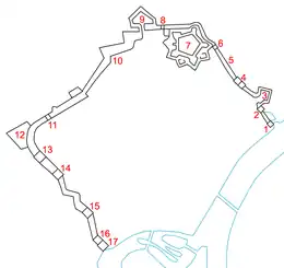 L'édifice est une tour carrée d'environ 10 mètres de côté réalisée en brique complétée par des boutisses en pierre calcaire[4]. Haute de deux niveaux, la tour possède des meurtrières, repose sur le rempart voûté et est précédée de murets défensifs.
