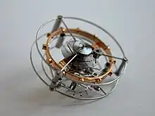 Plusieurs axes de rotations imbriqués créant un effet gyroscopique afin de compenser la rotation dans toutes les directions. Très coûteux néanmoins moins précis qu'une simple montre à quartz. La beauté de l'art et l'aspect visuel (le mécanisme est généralement bien visible pour être admiré) sont les motivations principales de ce luxe.