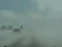 - Advection verticale : un certain mouvement vertical à l'échelle synoptique existe dans l'atmosphère, qui fait que la neige est soulevée plus haut par le vent. On voit alors la formation de vagues de poudrerie pouvant atteindre 500 mètres d'épaisseur. La visibilité varie entre ces vagues.