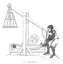 On développa également plus tard une variante du trébuchet, plus légère[12] et plus mobile, qui comportait deux contrepoids situés de part et d’autre de la verge et qui, de ce fait, portait le nom de couillard ou également de biffa.