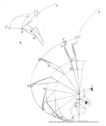La poulie I roulait sur un cordage peu tendu KL, afin de rendre le tirage des deux treuils aussi direct que possible. Au moment donc où il s’agissait d’abaisser la verge, tout en étant ainsi préparé, un servant étant monté attacher la corde double à l’anneau de la poulie de tirage, on décliquait le treuil tourné à rebours, les ressorts tendaient à reprendre leur position, ils faisaient faire un ou deux tours au treuil D dans le sens voulu pour l’abattage et aidaient ainsi aux hommes qui commençaient à agir sur les deux treuils, ce qui demandait d’autant moins de force que la verge s’éloignait de la verticale.