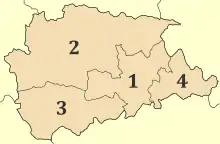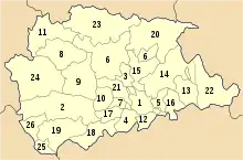Lors de la réforme Kallikratis (2011), les anciens 23 dèmes et 3 communautés du nome de Tríkala sont fusionnés en 4 nouveaux dèmes, dont ils deviennent des districts municipaux. Les numéros correspondent à leur emplacement sur la carte.