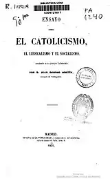 Malgré l'association de la pensée contre-révolutionnaire avec le carlisme, après le convention d'Ognate et pendant le règne d'Isabelle II, au cours duquel le carlisme fut interdit, l'idée traditionaliste s'exprimerait également à la marge du problème dynastique (dans le groupe péjorativement connu sous le nom de « néo-catholiques »), dont Jaime Balmes et Juan Donoso Cortés furent les principaux théoriciens[6]. Ils sont considérés comme les premiers à pleinement constituer une doctrine traditionaliste, au cours des années 1840 et 1850[48]. Tous deux élaborèrent des systèmes théoriques largement congruents, conciliant le catholicisme traditionnel avec le cadre constitutionnel de la monarchie isabelline[49]. Toutefois, aucun des deux ne se définit comme traditionaliste, un qualificatif qui leur fut appliqué de manière rétroactive[50]. Politiquement, Balmes cherchait à rapprocher les carlistes et les partisans de la reine — les membres du Parti modéré —[51] ; en raison de son parcours quelque peu éclectique et de ses efforts de conciliation, sa conception est appelée « traditionalisme évolutif »[52]. On parle de « traditionalisme radical » pour se référer à l'œuvre de Donoso Cortés, farouchement anti-carliste[53] ; le terme « radical » fait surtout référence à la reconnaissance d'un éventuel régime dictatorial, acceptable dans le cas où tout le reste échouerait face à une imminente menace socialiste apocalyptique — en révolution à la révolution de 1848 à Paris —. À la différence de Balmes, Donoso était lu et connu dans toute l'Europe, y compris d’hommes politiques comme Metternich[52]. Bien que membre des services diplomatiques espagnols, Donoso n’assuma pas d’importantes fonction au niveau de l’État, sa pensée n’eut pas de continuateur direct sur le plan strictement politique et son impact sur la politique réelle fut perceptible sans toutefois être décisif, dans la rédaction de la Constitution de 1845, la signaure du concordat de 1851 et à travers l’amitié qu’il entretenait avec Bravo Murillo[54]. Donoso fut le premier théoricien à être qualifié de traditionaliste, le terme commençant à apparaître dans le discours public au début des années 1850[55].