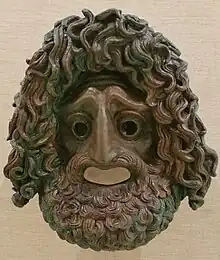 Cette origine religieuse a laissé des traces, comme le nom même du théâtre d'Athènes, dédié à Dionysos, ou encore le mot tragédie, qui semble refléter une signification religieuse. On fait habituellement dériver le grec ancien τραγῳδία / tragōidía de τράγος / trágos, « le bouc », et de ᾄδω / áidō, « chanter ». Le mot signifierait donc « chant du bouc »[8],[9],[note 3]. Le terme tragédie pourrait donc désigner une forme de dithyrambe joué par des acteurs déguisés en satyres et vêtus de peaux de boucs, hypothèse reprise par Aristote[10]. D'autres hypothèses, elles-mêmes défendues par certains auteurs antiques[11],[12], voient en cette évocation du bouc la récompense offerte au gagnant du concours, ou la victime d'un sacrifice effectué à cette occasion[13].