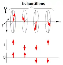 Le signal de l'oscillateur local du radar, qui sert à synchroniser l'émission des impulsions, est divisé en deux signaux qui sont décalés de 90 degrés et mélangés aux signaux reçus, et chacun va vers les deux détecteurs différents en même temps que le signal de réception. Ceci donne dans un détecteur la valeur de I (t) et dans l'autre produit Q (t) de la partie du bas où I correspond à l'intensité du signal à Q, la phase de réception[1].