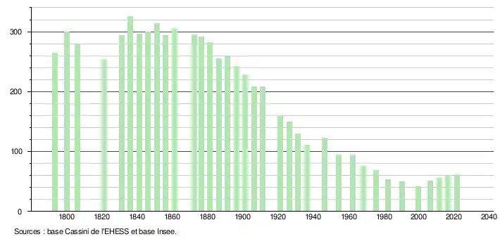 L'évolution du nombre d'habitants est connue à travers les recensements de la population effectués dans la commune depuis 1793. Pour les communes de moins de 10 000 habitants, une enquête de recensement portant sur toute la population est réalisée tous les cinq ans, les populations légales des années intermédiaires étant quant à elles estimées par interpolation ou extrapolation[21]. Pour la commune, le premier recensement exhaustif entrant dans le cadre du nouveau dispositif a été réalisé en 2006[22].