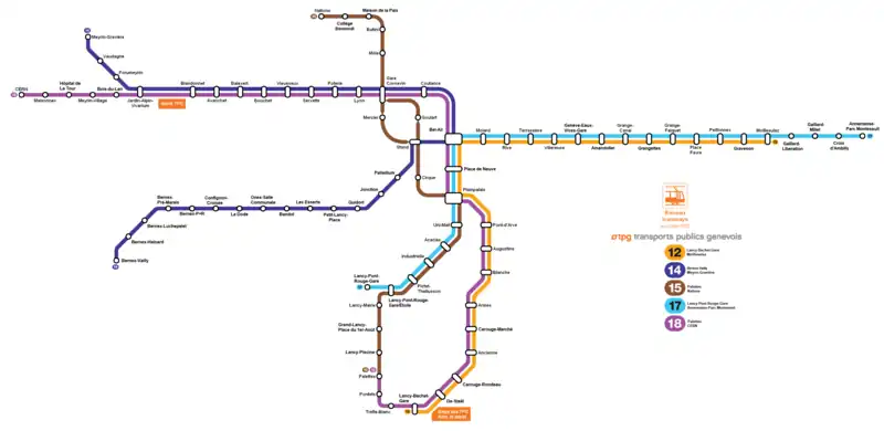 - Ligne 7 : Chantepoulet ↔ Le Grand-Saconnex ↔ frontière ↔ Ferney-Voltaire ;