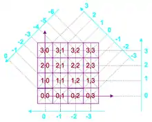 Avec les indices "k" comme "kolonne" et "l" comme "ligne", on définit un repère cartésien. Mais ici nous n'aurons besoin que des coordonnées entières. En rouge sur la figure 2, on voit que l'on a choisi arbitrairement le point bas gauche comme origine (position 0,0) et le sens des 2 axes. Dans chaque pixel est noté en rouge ses coordonnées.