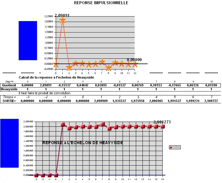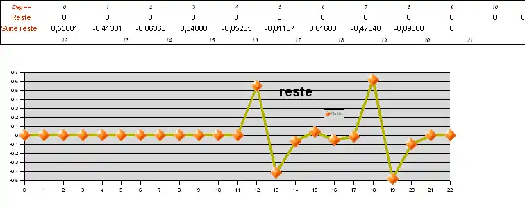 On peut vérifier sur un tableur ou à la main que ces polynômes répondent bien à la définition de la division euclidienne: H(z) = NUM(z)/DENOM(z)= Q(z)+ R(z)/DENOM(z). On suppose que le reste est négligeable par rapport aux coefficients du quotient. Les schémas de ces divers polynômes peuvent être visualisés sur un tableur comme suit.