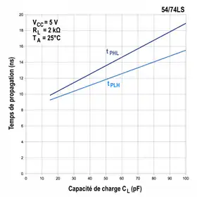Les temps de transition du signal à la sortie d'une porte logique intervenant dans les délais de propagation, ces derniers augmentent lorsque la charge connectée à la sortie est plus importante :