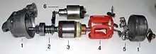 Les démarreurs motorisés sont, sur la plupart des véhicules thermiques motorisés actuels, électriques : ce sont de petits moteurs électriques qui, alimentés par la batterie du véhicule, délivrent un fort couple transmis au vilebrequin par un engrenage n'accouplant le démarreur au vilebrequin que pendant le court moment où le démarreur est actif. Le démarreur électrique est un équipement très répandu : il équipe notamment la quasi-totalité des automobiles, camions, motos et scooters modernes[14], ainsi que certains cyclomoteurs, et diverses autres machines. D'autres dispositifs sont possibles : démarreurs à air comprimé, à poudre, etc.