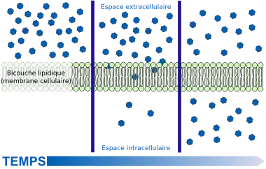 - et une certaine lenteur : les molécules doivent se dissoudre dans la double couche de phospholipides avant de passer de l'autre côté.