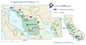 Actuellement, le 13e district comprend la partie nord-ouest du Comté d'Alameda. Les villes du district comprennent Alameda, Albany, Berkeley, Emeryville, Oakland, Piedmont et San Leandro[1]. Avec une cote Cook Partisan Voting Index de D + 40, c'est le district le plus Démocrate de Californie[2].