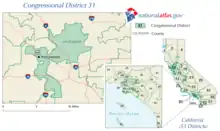 Depuis le redécoupage de 2020, le 31e district congressionel de Californie est situé dans le sud de la Californie. Il occupe une partie de l'est du Comté de Los Angeles.
