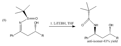 Le LiEt3BH réduit également les pyridines et les isoquinoléines respectivement en pipéridines et tétrahydroisoquinoléines (en)[7]. La réduction de β-hydroxysulfinyl-imines avec le catécholborane (en) et le LiEt3BH donne des alcools anti-1,3-aminés[8] :