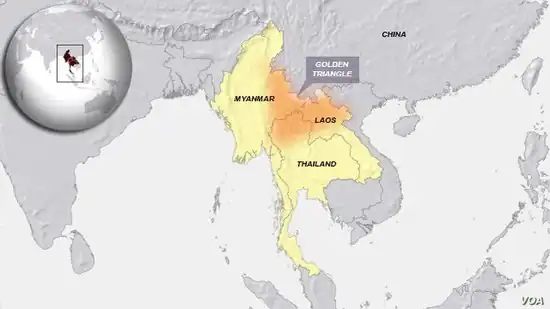 La Birmanie est le second producteur d'opium mondial après l'Afghanistan[5] et a été un acteur important du trafic international de stupéfiants depuis la Seconde Guerre mondiale[6],[7]. L'Office des Nations unies contre la drogue et le crime (UNODC) estimait à 430 km2 les surfaces consacrées à la culture du pavot somnifère (Papaver somniferum var. album) en Birmanie en 2005[8]. La reddition de la Mong Taï Army de Khun Sa en a été saluée par le gouvernement de Rangoon comme un succès majeur de la lutte contre la drogue, mais le manque de volonté politique à l'encontre des principaux groupes de narcotrafiquants, ainsi que la mollesse de la lutte contre le blanchiment d'argent continuent de saper cet effort. La plupart des minorités qui cultivent l'opium vivent en dessous du seuil de pauvreté[9],[10]. Dans les années 1980, la production d'opium du Triangle d'or représente plus de 70 % de la production mondiale ; en 2007, elle ne représente plus que 5 % environ de la production mondiale : le Triangle d'or est éclipsé par le Croissant d'or[11]. Au début des années 2000, héroïne et opium ont progressivement été remplacés par d'importantes quantités de méthamphétamine, le yaa baa, le "médicament qui rend fou"[12]. Depuis le début des années 2020, la région du Triangle d'or investit massivement dans la cybercriminalité[13].