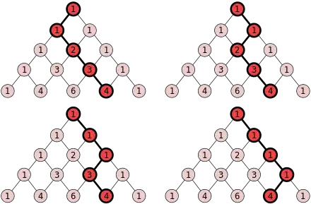 Imaginons que chaque nombre dans le triangle est un nœud dans un réseau qui est connecté aux nombres adjacents du dessus et du dessous. Maintenant pour n'importe quel nœud dans le réseau, comptons le nombre de chemins qu'il y a dans le réseau (sans faire une marche arrière) qui connecte ce nœud au nœud supérieur du triangle. La réponse est le nombre de Pascal associé à ce nœud.