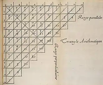 En Europe, il apparaît dans l'ouvrage de Peter Apian, Rechnung[4] (1527). Il est étudié par Michael Stifel (1486-1567)[5], Tartaglia (1499-1557) et François Viète (1540-1603). C'est d'ailleurs sous le nom de « triangle de Tartaglia » qu'il est connu en Italie. Il est également connu de Marin Mersenne (1588-1648)[6]. Mais c'est Blaise Pascal qui lui consacre un traité : le Traité du triangle arithmétique (1654) démontrant 19 de ses propriétés, propriétés découlant en partie de la définition combinatoire des coefficients. Nombre de ces propriétés étaient déjà connues mais admises et non démontrées. Pour les démontrer, Pascal met en place dans son traité une version aboutie du raisonnement par récurrence. Il y démontre le lien entre le triangle et la formule du binôme. Il l'utilise dans la résolution d'un problème de partage équitable des enjeux dans un jeu de hasard qui est interrompu avant le terme défini (problème des partis)[note 2].