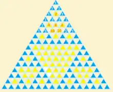Si l'on inscrit le triangle de Pascal dans une trame triangulaire, la réunion des cellules contenant des termes impairs est un triangle de Sierpiński.