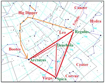 À noter qu'Arcturus, Spica et Dénébola forment un remarquable triangle équilatéral souvent appelé également Triangle du printemps.