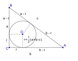 Dans tout triangle rectangle, les bissectrices se rencontrent en un point O centre du cercle inscrit dans le triangle. Le rayon de ce cercle est égal au demi-périmètre p moins l'hypoténuse (voir schéma) soit, avec les notations précédentes :