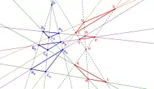 Alors les triangles A1B1C1, A2B2C2 et A3B3C3 forment un triplet de triangles homologiques et leurs pôles d'homologie sont alignés.
