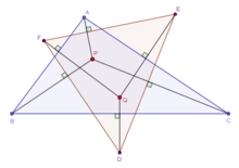 En géométrie, deux triangles sont dits orthologiques si les perpendiculaires issues des sommets de l'un d'eux aux côtés correspondants de l'autre sont concourantes (c'est-à-dire qu'elles se coupent en un seul point ). Il s'agit d'une propriété symétrique ; c'est-à-dire que si les perpendiculaires des sommets A, B, C du triangle △ABC aux côtés EF, FD, DE du triangle △DEF sont concourantes alors les perpendiculaires issues des sommets D, E, F de △DEF aux côtés BC, CA, AB de △ABC sont également concourantes. Les points de concurrence sont appelés centres orthologiques des deux triangles[1],[2], et si ces deux points sont différents, la droite passant par ces deux points est appelée axe d'orthologie.