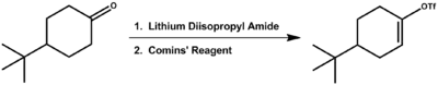 La réaction de triflation peut se faire en faisant réagir un alcoolate, phénolate ou énolate avec un donneur de triflyle tel que le phényltriflimide ou le réactif de Comins. Ces esters peuvent être aussi formés plus vigoureusement sur tout type d'alcools par réaction avec du chlorure de l'acide trifluorométhanesulfonique ou de l'anhydride triflique en présence d'une base comme la pyridine[8],[9] ou la triéthylamine.