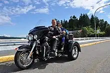 Les trikes sur base moto[56] sont des motos, neuves ou non, converties en trois roues à large empattement arrière, qui gardent l'essentiel de leurs caractéristiques et leur look initiaux, le plus souvent de grosses cylindrées, suréquipées d'origine, rarement personnalisées façon chopper. Il est théoriquement possible de transformer soi-même une moto en trike en commandant un kit (notamment sur Internet) — par exemple, le kit vendu par Santiago Chopper permet de transformer en trike une Yamaha XVS 950 Midnight Star — mais le montage nécessite une bonne dose de compétence et l'homologation individuelle est toujours aléatoire[57]. D'autres solutions alternatives existent, notamment aux États-Unis et au Canada où il existe des kits amovibles pouvant équiper notamment les tourings Harley-Davidson, ce qui laisse la moto intacte (voir photo)[58] et, récemment, le japonais Kreissieg propose un kit fixe « KSG » permettant d'obtenir un engin étroit, dont les roues arrière peuvent pencher[59]. La solution habituelle consiste actuellement à choisir un trike « clé en main » ou à s'adresser à des transformateurs utilisant des kits standards visant à obtenir un engin qui se conduit à plat comme un trike ordinaire. En Europe, les allemands Boom Trikes (jusqu'en 2012) et rewaco proposent des motos déjà converties en trikes (Bike Conversion), accessibles en France, sur la base de modèles customs tels que les Yamaha MT-01, Honda Shadow VT 750, Suzuki Intruder (800, 1500 et 1800) et Triumph Rocket III[60]. L'anglais Grinnall transforme des BMW comme la R 1200 C[61]. Au Canada, RC Trike et aux États-Unis, Roadsmith[62], Lehman, Motortrike, Side Car Californie, Ace Motorworks, Cool Custom Trikes, Champion, Hannigan, Trikes For You font de même, entre autres. Lehman, par exemple, convertit en trike des tourings Harley-Davidson (supra, le trike utilisé par Poutine), Gold Wing, Kawasaki Vulcan 900, Suzuki Boulevard C90 et Victory Vision[63]. Depuis 2009, la marque Harley-Davidson, qui dérive ainsi son traditionnel servi-car, produit elle-même des trikes d'usine, d'abord un « Tri Glide » sur une base Electra Glide Ultra Classic, puis en 2011 un « Street Glide Trike »[64] (abandonné depuis), et le « Freewheeler » sorti en 2015[65], destinés initialement seulement au marché d'Amérique du Nord[66]. Le Tri Glide Ultra est importé en France à partir de fin 2013 avec une nouvelle motorisation et une nouvelle planche de bord[67] et le Freewheeler, fin 2016.