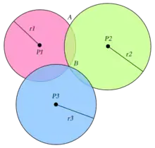 Si trois points de référence émettent un signal d'intensité d'émission connue par un récepteur, il est possible de connaitre la distance entre chacun de ces points et le récepteur. Il apparait alors le point récepteur qui est l'intersection de 3 sphères.