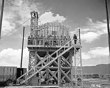 Gadget fut hissé jusqu'au sommet de la tour en acier de 30 mètres, où se trouvait une plate-forme en bois et un abri rudimentaire en tôle ondulée ; des matelas avaient été positionnés à la base de la tour au cas où le câble céderait[50]. Le choix d'une explosion en hauteur était destiné à simuler un largage par un bombardier, et à réduire la contamination radioactive du sol. Une équipe composée de Bainbridge, Kistiakowsky, Joseph McKibben et de quatre soldats dont le lieutenant Bush réalisa l'armement final peu après 22 h le 15 juillet[50].