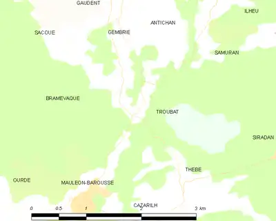 Troubat est limitrophe de six autres communes. Au sud, le territoire communal n'est distant que de 150 mètres de celui de Cazarilh.