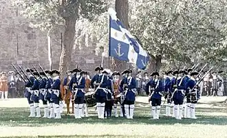 Les troupes de la Marine furent envoyées par Louis XIV en 1682 pour remplacer les troupes régulières en Nouvelle-France, et furent utilisées pour mettre en garnison dans les colonies françaises. Entre 1683 à 1688, le roi fait passer trente-cinq compagnies au Canada. Mais comme la mortalité et le licenciement des soldats qui se marient et se font habitants diminuent considérablement les effectifs, Seignelay décide de réduire le nombre de compagnies à vingt-huit le . Il restera pratiquement inchangé jusqu’au début de la guerre de Sept Ans. Versailles renvoie alors des renforts en fixant le nombre de compagnies à quarante. À la fin du régime français, 2 600 soldats des troupes de la Marine sont présents au Canada. Ces effectifs sont relativement importants par rapport au nombre total d’habitants puisqu’en 1688 par exemple, le Canada abrite 1 418 soldats pour une population d'environ 10 300 personnes[25]. Dans un premier temps, les officiers présents au Canada viennent tous de France. Mais dès 1685, des « gentilshommes » canadiens obtiennent des places dans les troupes de marine. Les deux premiers, les fils La Durantaye et Bécancourt, s’embarquent pour Rochefort où ils reçoivent une formation de gardes de la marine. Rapidement, le corps des officiers des troupes de la marine se « canadianise ». Au début du XVIIIe siècle, environ le tiers des officiers est né au Canada, puis plus de la moitié en 1722. Vers 1740, les officiers sont pratiquement tous recrutés localement[26].