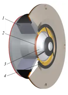 En rouge : membrane avec bobine mobile et suspension