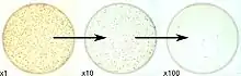 - Les méthodes de Miles et Misra (ou méthode de dépôt sur plaque) où un très petit aliquot (généralement environ 10 microlitres) d'échantillon de chaque dilution en série est déposé sur une boîte de Petri. La gélose doit être lue pendant que les colonies sont très petites pour éviter la perte d'UFC lors de leur croissance[10].