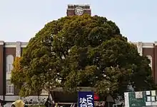 L’université se dote à l’occasion d’une course d’aviron en 1920 d’une couleur pour se représenter, le bleu foncé, en opposition à l’université de Tokyo qui utilise alors le bleu clair[55]. À la suite d’un rescrit impérial à l’intention des étudiants de 1939, l’université sélectionne en 1940 des travaux étudiants pour se doter d’un chant et d’un drapeau officiel. Ces derniers sont depuis utilisés lors de cérémonies officielles comme les remises de diplômes ou les rentrées universitaires[56],[57]. Le camphrier présent à l’entrée du campus de Yoshida est aussi utilisé pour représenter l’université depuis les années 1930, mais ce n’est que dans les années 1950 qu’à la suite d’une proposition d’Ogawa, un professeur de l’université, cet arbre intègre le sceau de l’université. Ce dernier est officiellement utilisé par l’université depuis un vote de son conseil d’administration datant du [55].