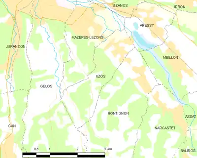 Paul Raymond[43] note qu'en 1385, Uzos comptait douze feux et dépendait du bailliage de Pau.