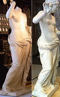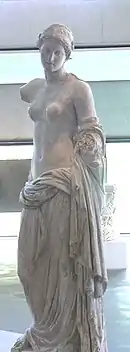 Un type iconographique — On dit parfois d'une Vénus qu'elle est « de type d'Arles », notamment lorsqu'elle est de style classique, à demie dénudée et qu'elle tient des attributs dans ses mains. Les plus fameux exemples sont, d'une part une antique en marbre encore à Versailles dite la « Vénus Cesi »[230] et, d'autre part, l'Aphrodite acéphale du Capitole (supra), sans compter d'autres statues clairement rattachées à ce type[71],[231]. Dans son ouvrage Johan Flemberg présente des statues très proches du type d'Arles, dans l'attitude et le mouvement[232]. Dans sa thèse sur la Syrie romaine, Nada Ghraoui dénombre vingt-huit cas relevant de ce type dans son champ d'investigation[233]. (Voir aussi les créations artistiques autour de la Vénus infra.)