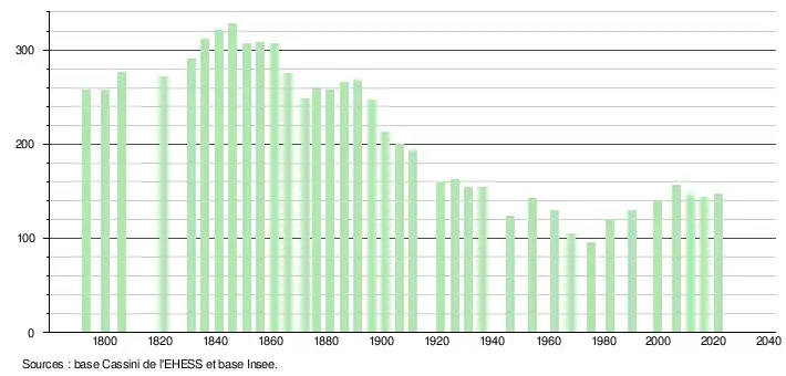 L'évolution du nombre d'habitants est connue à travers les recensements de la population effectués dans la commune depuis 1793. Pour les communes de moins de 10 000 habitants, une enquête de recensement portant sur toute la population est réalisée tous les cinq ans, les populations légales des années intermédiaires étant quant à elles estimées par interpolation ou extrapolation[37]. Pour la commune, le premier recensement exhaustif entrant dans le cadre du nouveau dispositif a été réalisé en 2006[38].