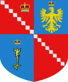 - Écartelé, aux 1 et 4, de gueules, à huit losanges d'argent, rangées en bande et aboutées, acc. au canton senestre du chef d'une couronne d'or, au 2, d'azur, à l'aigle éployée d'or, surmontée d'une couronne impériale, au 3, d'azur, à un membre d'aigle d'or, couronné du même (ou de gueules au dragon ailé de sinople, ayant deux pattes, rampant, la queue dardant en bas). Cimier: un buste d'homme, habillé d'un manteau d'azur, au rabat d'argent, coiffé d'un bonnet albanais d'azur, retroussé de gueules.(Venise, comtes)