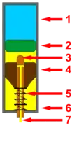 Elle se compose de nombreux éléments : tout d'abord le pointeau 3, qui évacue l'huile en provenance de l’amortisseur (lorsque celui-ci se comprime, si 7 est ouvert) vers la chambre principale 6 en jaune. Les ouvertures latérales du pointeau sont initialement obturées par la masselotte 4, maintenue en son point haut par le ressort. La partie supérieure du montage est composée du piston mobile,2, qui délimite la séparation entre la chambre principale (huile, fluide incompressible) et la chambre supérieure (remplie d'azote sous pression, qui est un fluide compressible).
