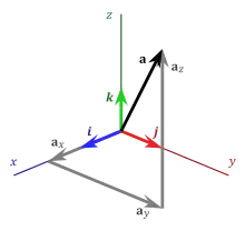 Par exemple, dans la figure ci-contre, le vecteur euclidien a est représenté par une flèche noire dans un système de coordonnées cartésiennes en 3 dimensions (). On a représenté également les vecteurs unitaires () ainsi que les composantes () du vecteur a.