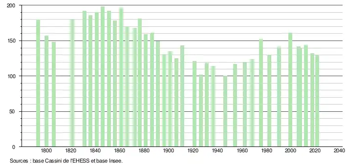 L'évolution du nombre d'habitants est connue à travers les recensements de la population effectués dans la commune depuis 1793. Pour les communes de moins de 10 000 habitants, une enquête de recensement portant sur toute la population est réalisée tous les cinq ans, les populations légales des années intermédiaires étant quant à elles estimées par interpolation ou extrapolation[17]. Pour la commune, le premier recensement exhaustif entrant dans le cadre du nouveau dispositif a été réalisé en 2007[18].