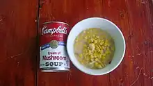 Maïs frais dans un velouté de champignons en conserve (Philippines).
