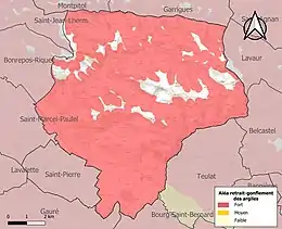 Le retrait-gonflement des sols argileux est susceptible d'engendrer des dommages importants aux bâtiments en cas d’alternance de périodes de sécheresse et de pluie. 90,3 % de la superficie communale est en aléa moyen ou fort (88,8 % au niveau départemental et 48,5 % au niveau national). Sur les 1 298 bâtiments dénombrés sur la commune en 2019, 1 169 sont en aléa moyen ou fort, soit 90 %, à comparer aux 98 % au niveau départemental et 54 % au niveau national. Une cartographie de l'exposition du territoire national au retrait gonflement des sols argileux est disponible sur le site du BRGM[27],[Carte 3].