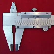 - La précision visée est , soit 1/50 de la précision des graduations de la partie fixe (c'est ce type de vernier qui est représenté sur la photo en haut de l'article).