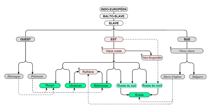 | Langues filles | russe, ruthène, biélorusse, ukrainien, rusyn |