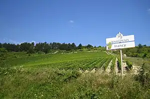 - Irancy : La surface totale plantée est de 160 hectares[1]. Irancy est situé sur les communes d'Irancy, de Cravant et de Vincelottes à environ 15 kilomètres au sud-est d'Auxerre. On y produit exclusivement du vin rouge.