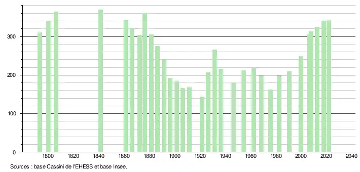 L'évolution du nombre d'habitants est connue à travers les recensements de la population effectués dans la commune depuis 1793. Pour les communes de moins de 10 000 habitants, une enquête de recensement portant sur toute la population est réalisée tous les cinq ans, les populations légales des années intermédiaires étant quant à elles estimées par interpolation ou extrapolation[17]. Pour la commune, le premier recensement exhaustif entrant dans le cadre du nouveau dispositif a été réalisé en 2007[18].