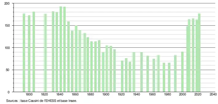 L'évolution du nombre d'habitants est connue à travers les recensements de la population effectués dans la commune depuis 1793. Pour les communes de moins de 10 000 habitants, une enquête de recensement portant sur toute la population est réalisée tous les cinq ans, les populations légales des années intermédiaires étant quant à elles estimées par interpolation ou extrapolation[18]. Pour la commune, le premier recensement exhaustif entrant dans le cadre du nouveau dispositif a été réalisé en 2008[19].